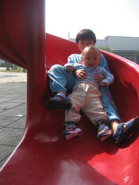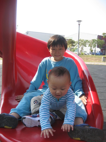 剛開始,哥哥玩溜滑梯,弟弟就是來回散步,