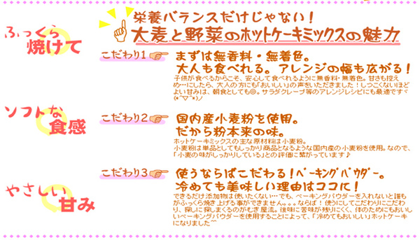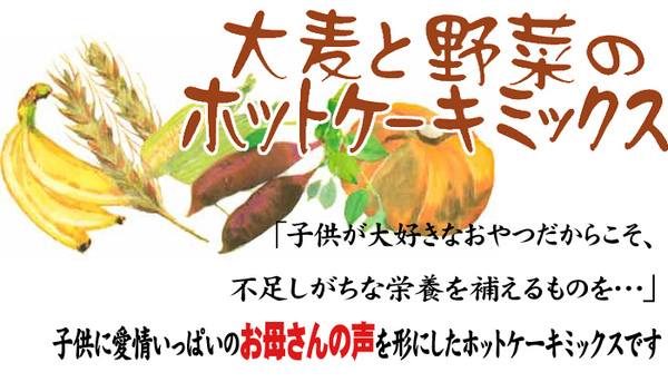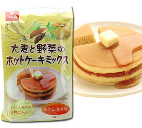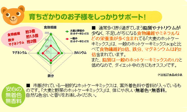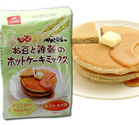 | 野菜嫌いのお子様やダイエット中の方にも! 深く優しい味わいと、カルシウムや鉄分などの栄養がうれしい お豆と雑穀のホットケーキミックス 2種類のお豆「大豆、小豆」と5種類の穀物「大麦、もちきび、もちあわ、黒米、黒ごま」をミックスしたホットケーキミックスです。 従来品よりもふっくら感が増し、もちもちとしたやわらかい食感になっております。また、焙煎方法をこだわった黒ごまを使用し、香ばしい焼き上がりなりました。 一般のホットケーキミックス(*)と比較して、カルシウム・食物繊維・鉄分が約2倍、マグネシウムは約2.5倍多く含まれています。(*五訂食品成分表より) 体にいいホットケーキで、朝食やおやつを健康に、そして、お友達とのホットケーキパーティーで笑顔になりませんか??? |