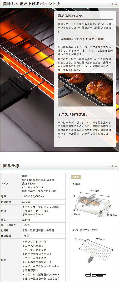 | 備考 | ・パンくずトレイ付 ( お手入れ簡単 ) ・ベーキングラック ( 取手付で扱いやすい ) ・アラーム付タイマー ( ベルの音でお知らせ ) ・クイックアクションヒーター ( 予熱不要 ) ・ステンレス製熱反射プレート ( 庫内の温度を一気に250度 ) |