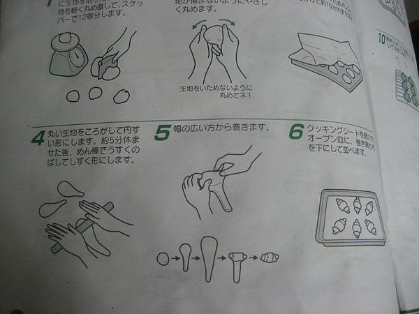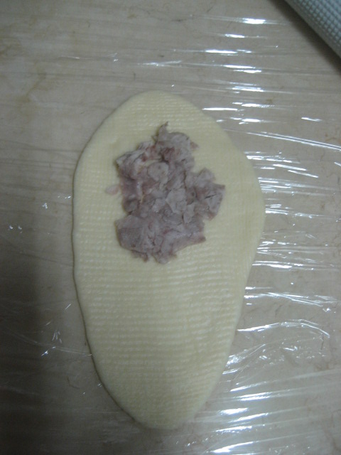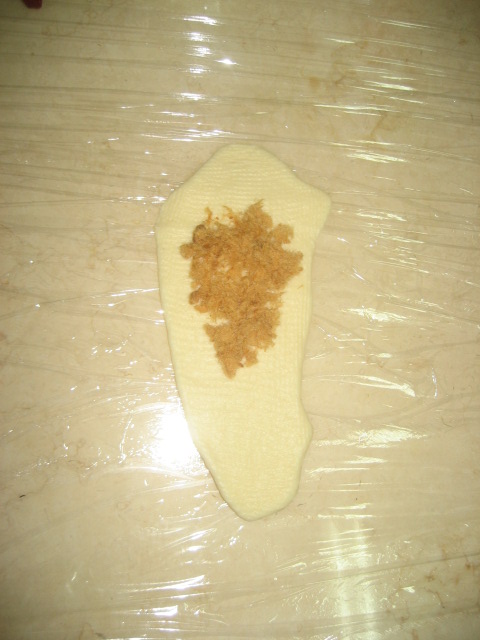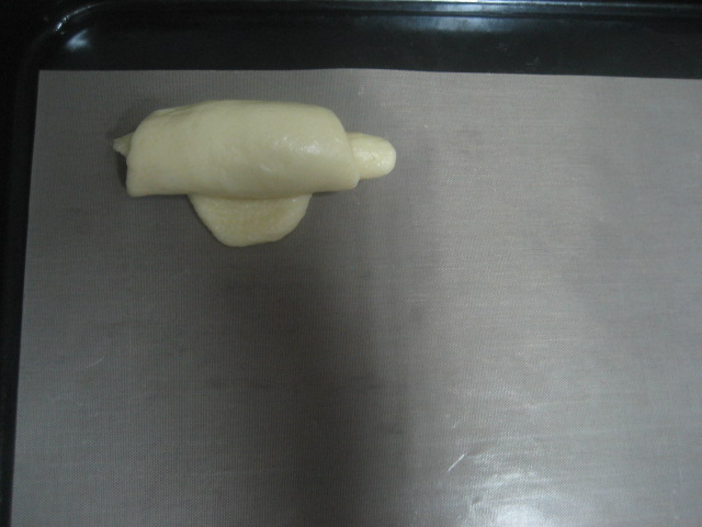 把麵糰桿平,料加入,一樣捲成牛角狀