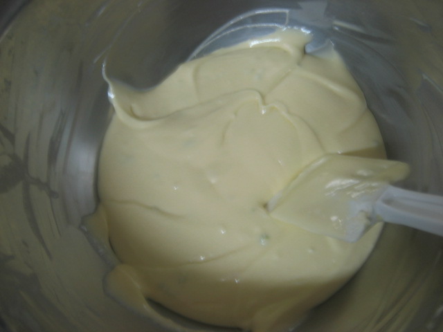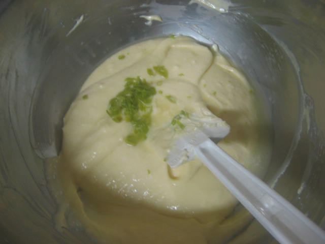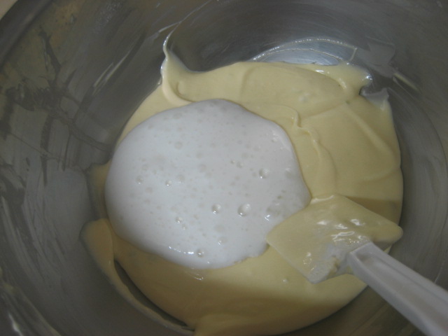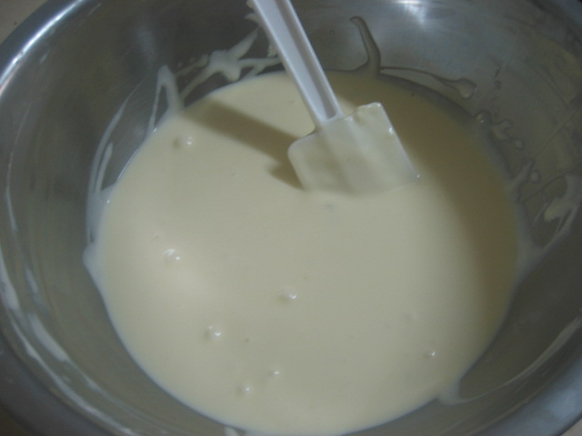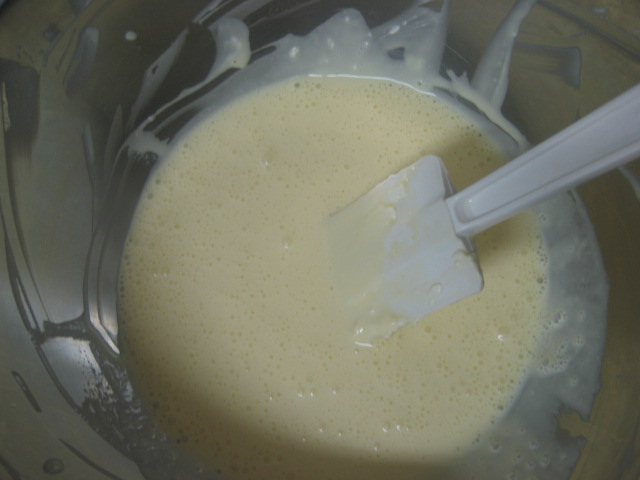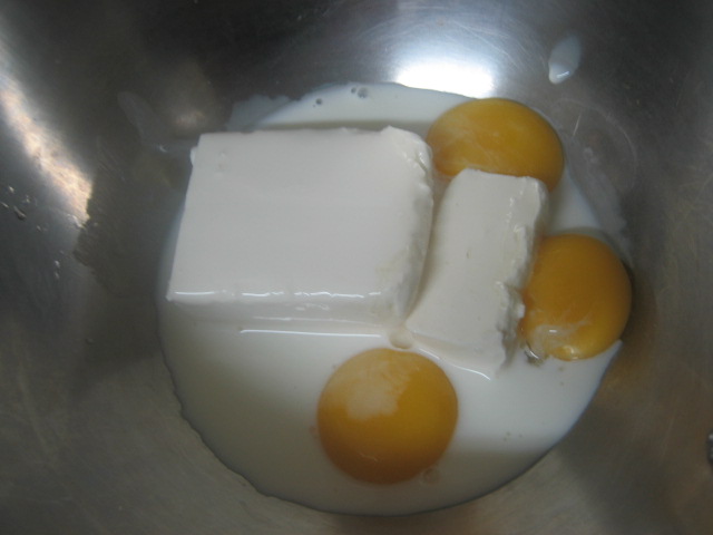 cream cheese加入蛋黃跟牛奶攪拌,攪拌後顏色比我上一次做的漂亮許多