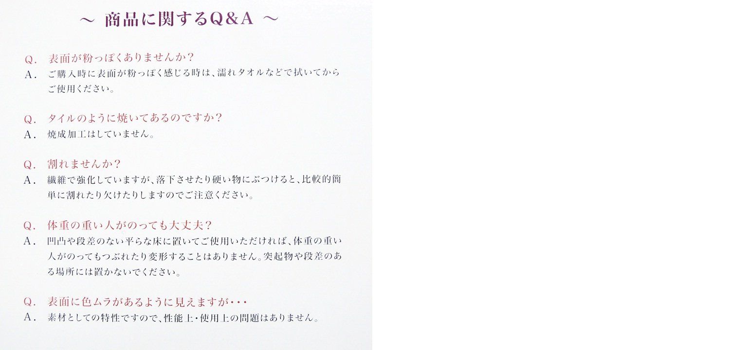 - 主成分:珪藻土、珪酸系骨材、無機質繊維。※アスベストは含有していません。